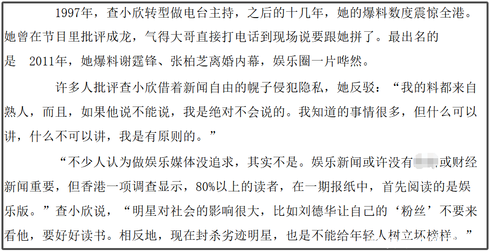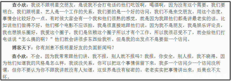 这里就不去评价查小欣行为是否正确了,她接受采访数次聊起了自身职业,在查小欣看来,狗仔的存在是因为明星有影响力,需要外界监督,她拿来当一份工作在做,自己心中有原则。