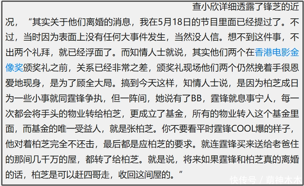 不过要说查小欣最强战绩,还得是爆料谢霆锋和张柏芝离婚。