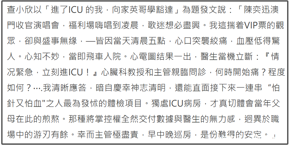 查小欣本来计划前去观看陈奕迅演唱会,结果清晨五点察觉自身情况不对,心口绞痛血压低,她果断打车去看了急诊,医生一看她的心电图就安排查小欣进了ICU。