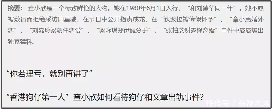 说起来查小欣不是第一次当明星工具人了,她和刘德华同期入圈,成为娱记之后,曝过刘德华妻子怀孕、曝过章小蕙出轨、曝过刘嘉玲和梁朝伟恋爱、曝过郑伊健和梁咏琪分手,全部都是独家消息,被称为香港狗仔队之母,手握太多港圈秘辛。