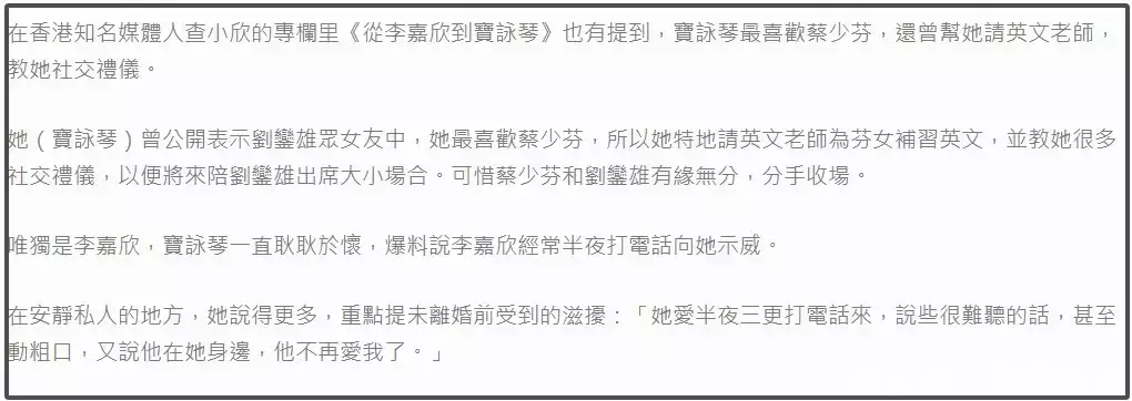 ——港圈经典“小三打电话骂大婆”就是查小欣曝光的,查小欣和刘銮雄前妻宝咏琴是好友,曾经出过一本书名为《从李嘉欣到宝咏琴》,里面详细讲述了李嘉欣挑衅宝咏琴的细节。