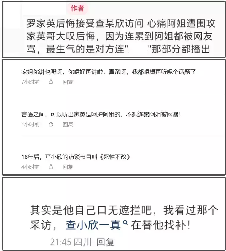 罗家英后续回应后悔接受查小欣采访,查小欣紧接着被骂,不过也有网友指出,查小欣一直帮罗家英找补,明明是罗家英自己总是拿他和汪明荃的婚姻制造话题。